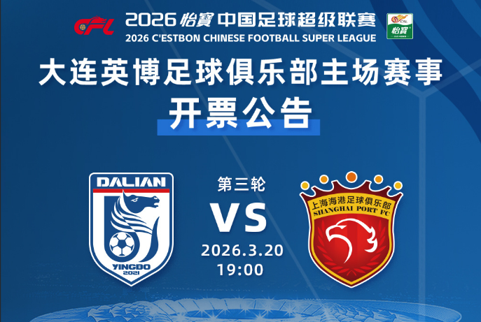 3月20日(星期五)19:00,在2026赛季中超联赛第3轮中,大连英博将坐镇主场大连梭鱼湾足球场,迎战卫冕冠军上海海港。3月15日下午,大连英博足球俱乐部发布了这场比赛的票务公告。